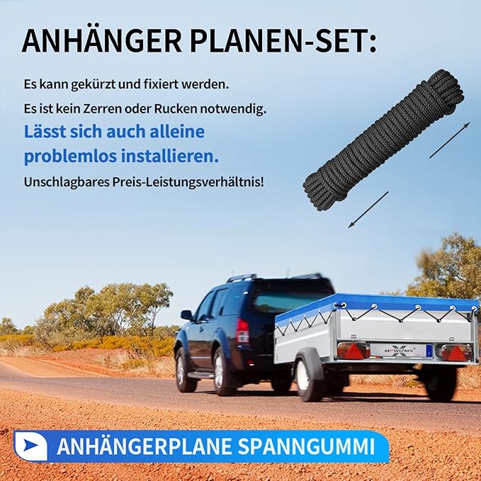 - Praktisches Komplett-Set: Die Lieferung inklusive einem 7 Meter langen, robusten Planenseil ermöglicht eine schnelle, sichere und feste Befestigung am Anhänger.