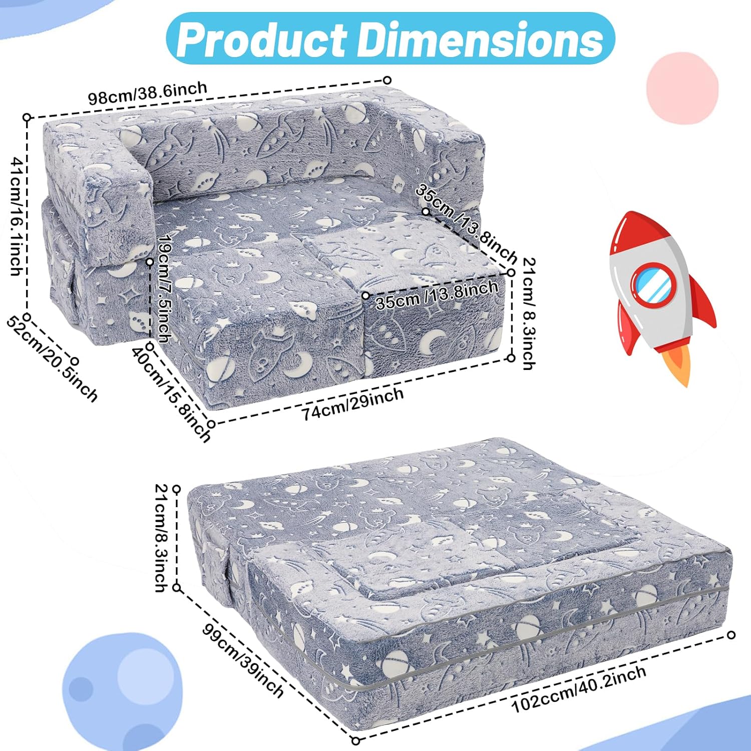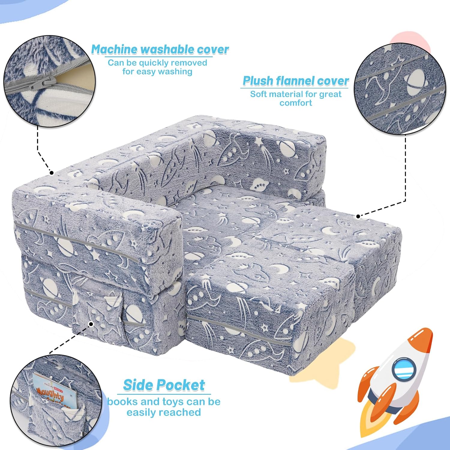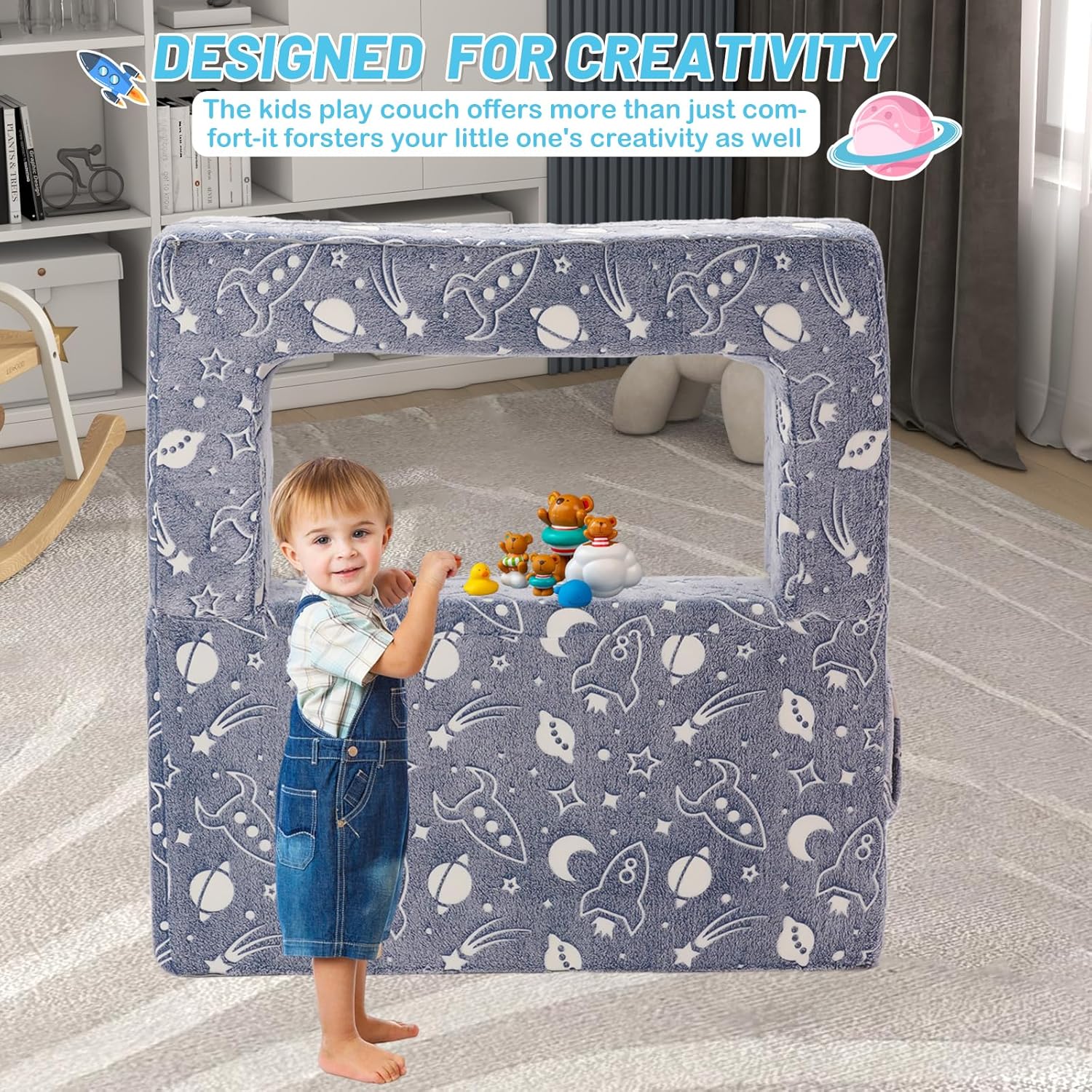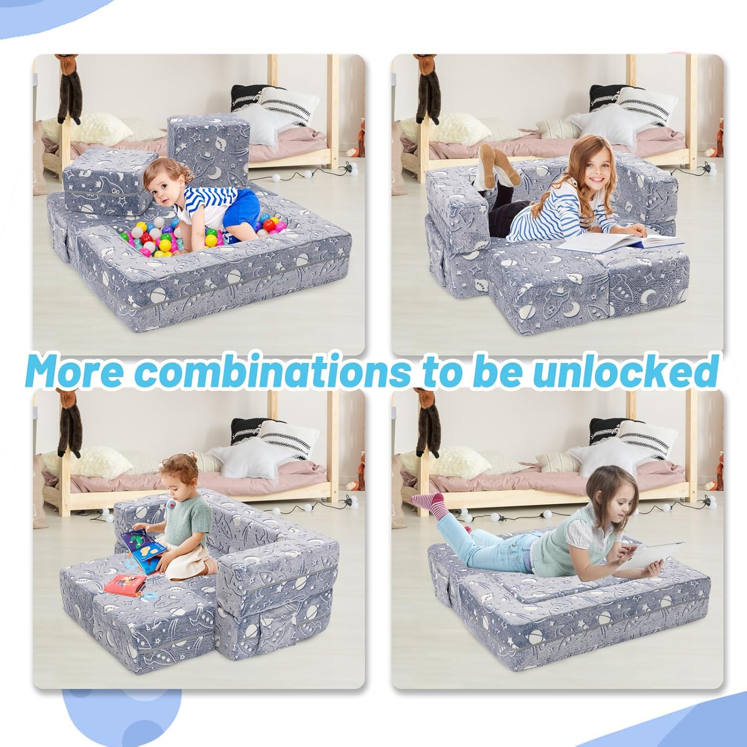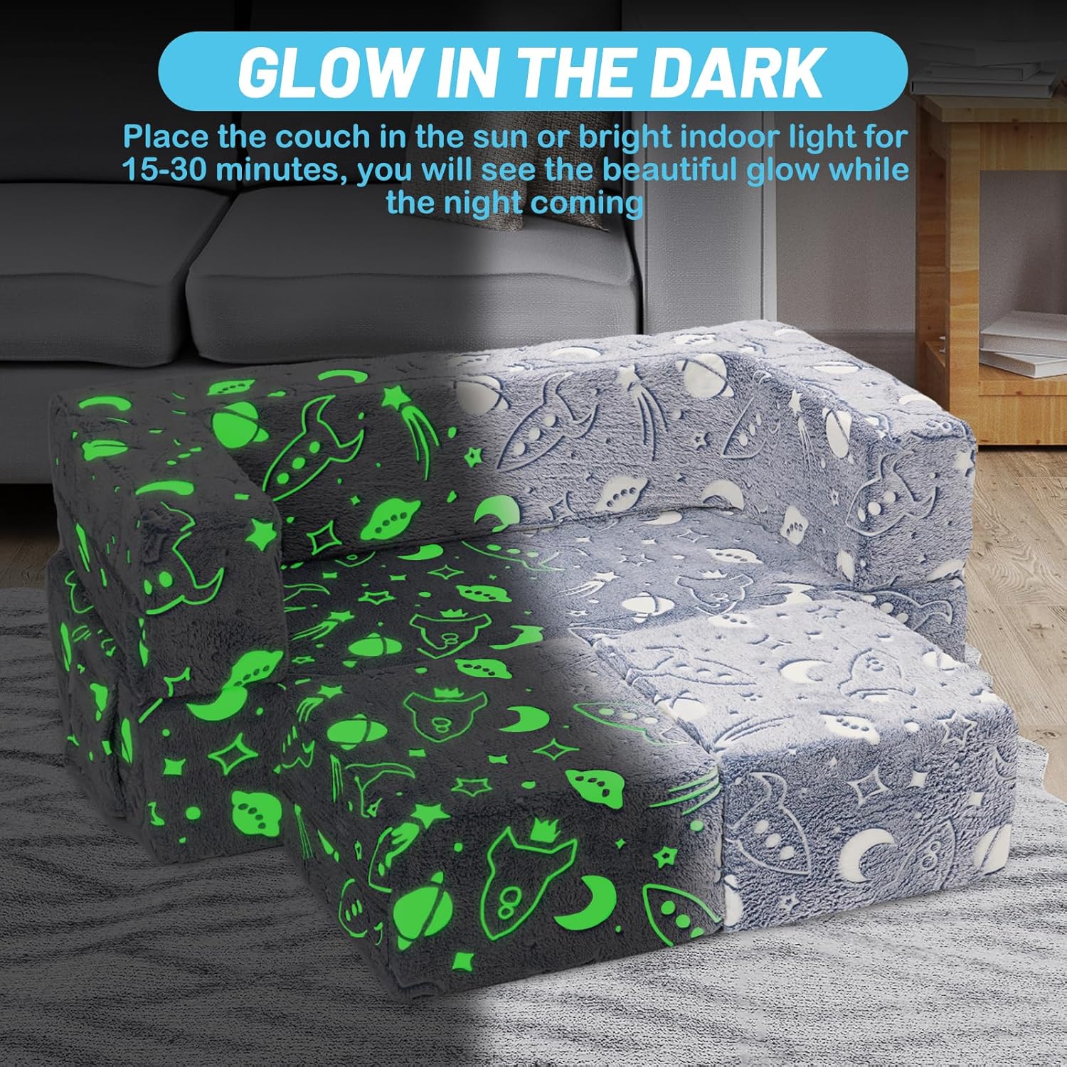 Die YULEYU modulare Kinderspielcouch ist ein vielseitiger Begleiter, der mitwächst und sich den Bedürfnissen Ihres Kindes anpasst. Durch das magische Glow-in-the-Dark-Element wird sie zum Highlight im Kinderzimmer und schafft eine einzigartige, gemütliche Atmosphäre für Spielen, Lesen und Träumen.
