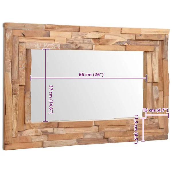 - Warmes Design mit Teakholz-Rahmen: Der Rahmen aus Teak-Optik verleiht dem Spiegel eine natürliche, skandinavisch anmutende Eleganz. Die warme Holzfarbe passt zu vielen Einrichtungsstilen.
